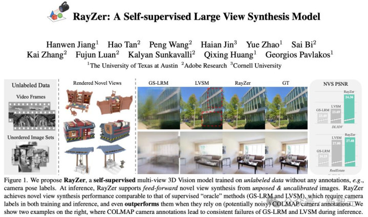 具体来说,RayZer将未知姿态、未经校准的图像作为输入,恢复相机参数,重建场景表示,并合成新视角。