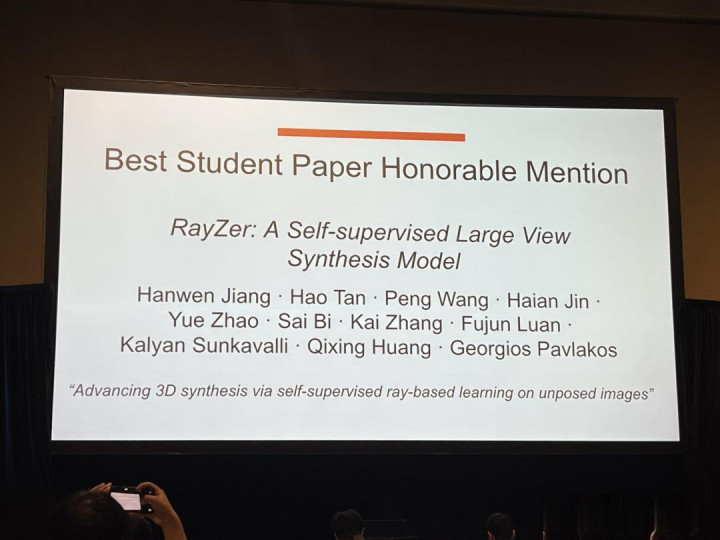 来自UT-Austin、Adobe、康奈尔大学团队,获得了最佳学生论文荣耀提名,因基于未知姿态图像的自监督光线学习推进3D合成而获奖。