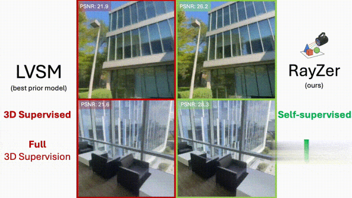在训练过程中,RayZer仅依赖自身预测的相机姿态来渲染目标视图。